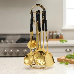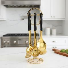 Ceramic and steel kitchen utensil set, suitable as a gift and will enhance the elegance of your kitchen in an excellent way. It is also very important for cooking and helps you cook your favorite dishes. goldyn and black color.