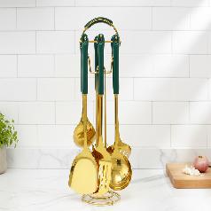 Ceramic and steel kitchen utensil set, suitable as a gift and will enhance the elegance of your kitchen in an excellent way. It is also very important for cooking and helps you cook your favorite dishes. Goldin and Turquoise color.