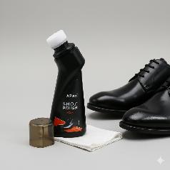 A Black liquid shoe polish designed to nourish and protect leather shoes. The product comes with a sponge for easy, mess-free application. Designed for use on leather shoes to restore their color and shine.