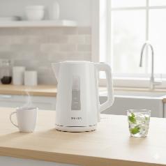 The stylish white Philips kettle heats water to boiling in an instant. The kettle has a power of 2200 watts, so the efficient heating element brings water to a boil quickly.
