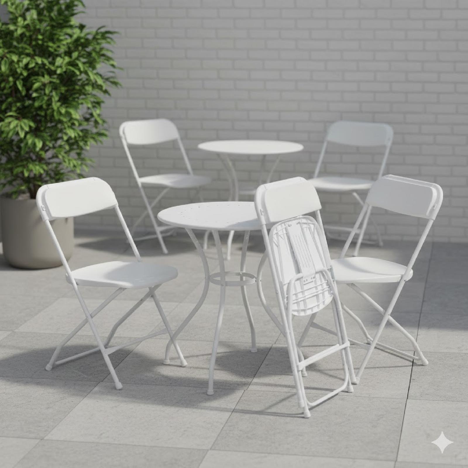A strong and durable white folding chair used for trips and transportation. Easy to use and carry.