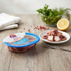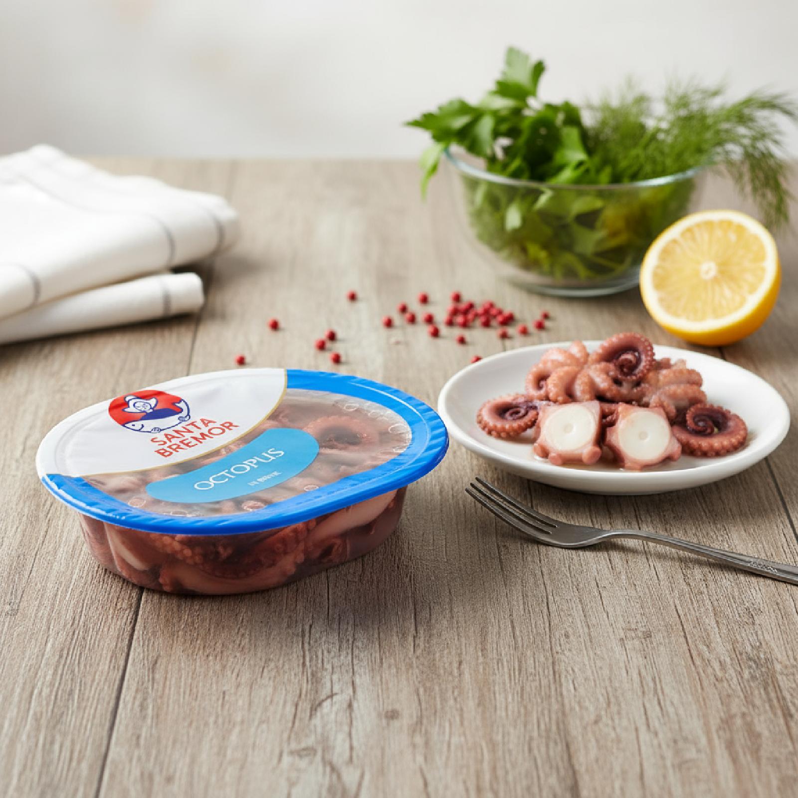 Baby octopus carefully preserved in a water and salt solution, soft in texture and with a light marine aroma, ideal for preparing or serving in seafood dishes.