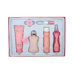 A women's gift set consisting of 6 pieces, which includes Delina fragrance - a feminine scent - along with a small tester, lip gloss, body fragrance, body cleanser, and body lotion.