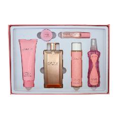 The 6-piece ladies gift set consists of a large fragrance and a small tester with notes of bitter orange, tulip, rose and musk, plus a lip moisturizer, body deodorant, body cleanser and body lotion.
