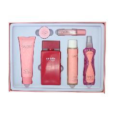 A women's gift set consisting of 6 pieces including a perfume and a small tester perfume with floral and fruity notes, along with lip balm, body deodorant, body cleanser, and body moisturizer.