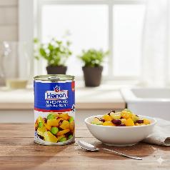 Canned mixed fruits are a colorful and delicious mix of assorted fruit pieces that can be eaten as is as a cold dessert, or used to decorate sweets, juices and cocktails, adding a touch of perfect flavor to any dish.