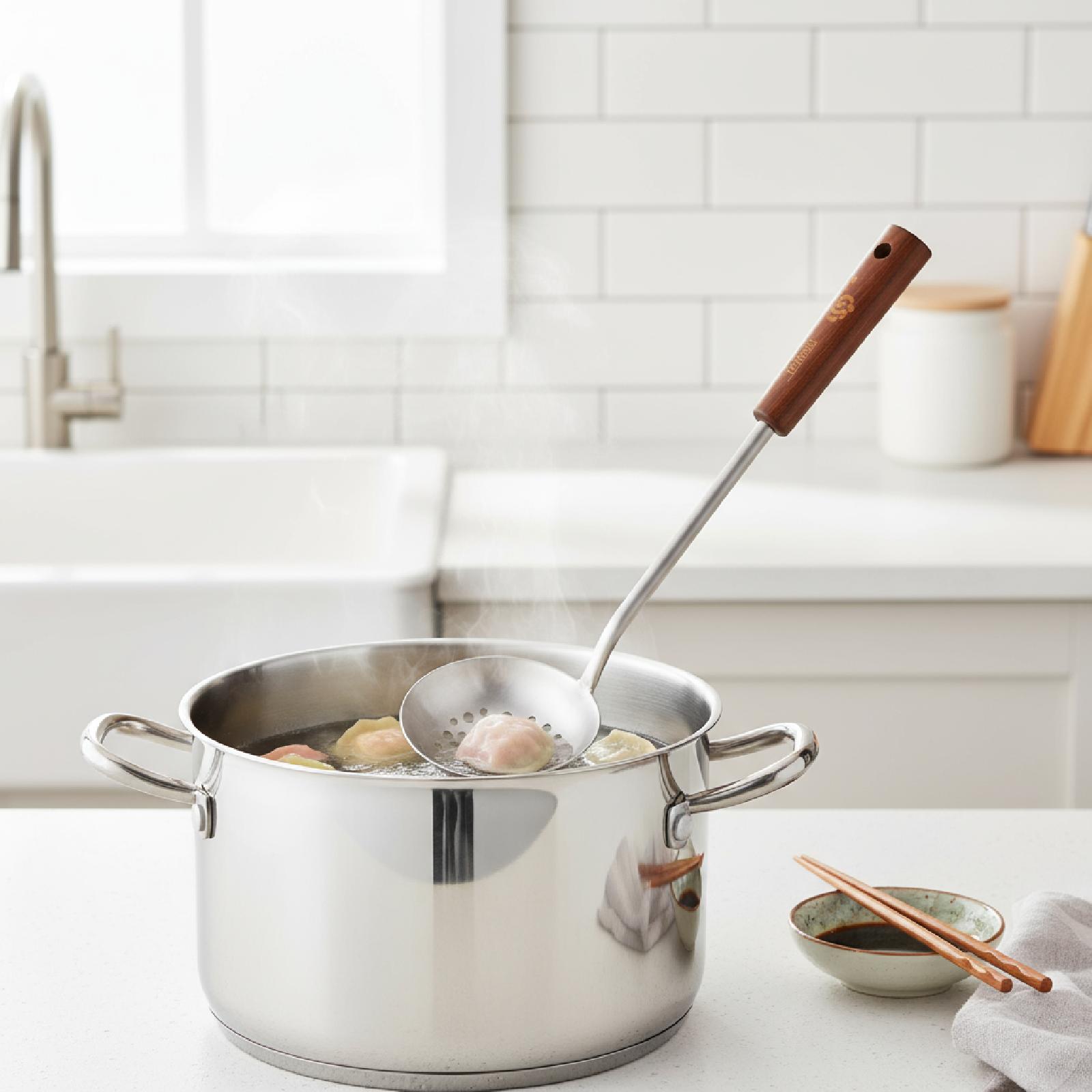 A steel spoon with a wooden handle that never gets hot, suitable for mixing and stirring food.