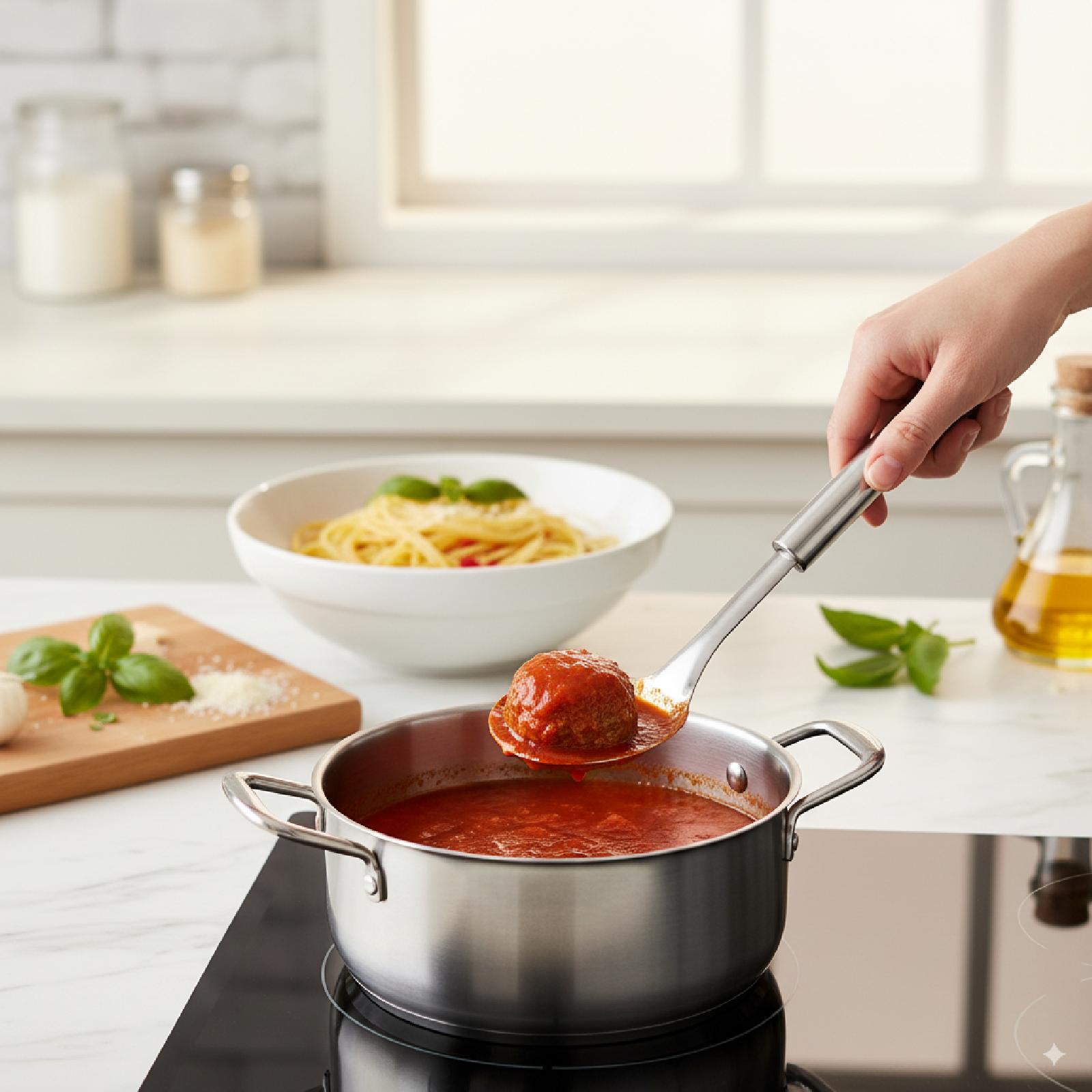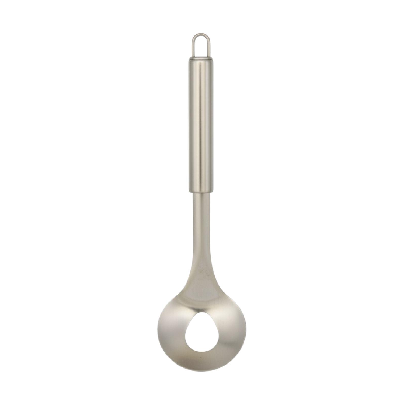 A unique and multi-purpose spoon with a hole inside that you can use to scoop pasta or meatballs or to form meatballs using the hole inside.
